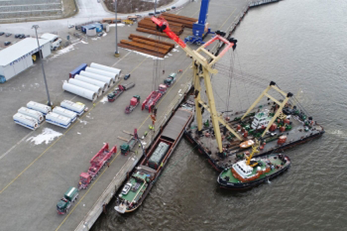 285 Tonnen schwerer Trafo im Schwerlasthafen Rendsburg Port umgeschlagen. Trafo sorgt für sicheren Netzbetrieb im Umspannwerk Audorf bei steigender Grünstromeinspeisung.